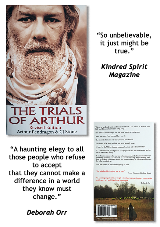 'The Trials of Arthur' 2012 revised edition by Arthur Pendragon and CJ Stone. Cover photo by Vanessa Winship. Published by The Big Hand.